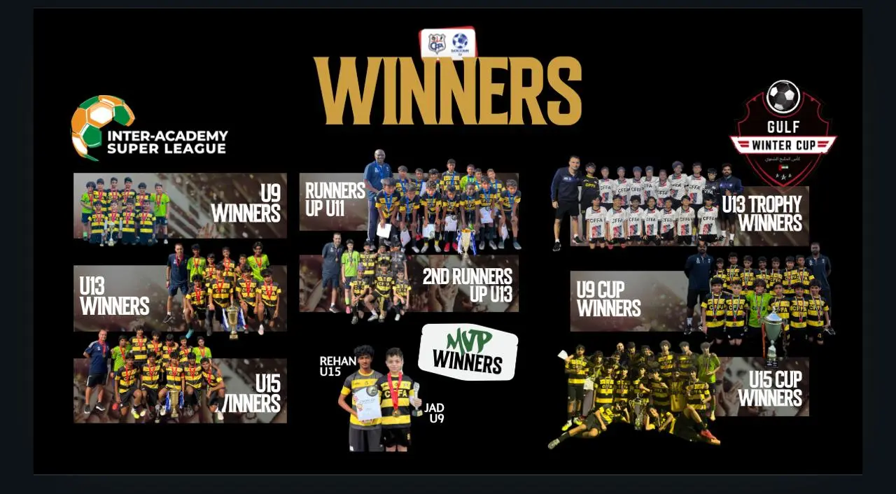 CFFA continues to dominate youth football in the UAE: We were winners in multiple categories of the ISL, DOFA, and Gulf Winter Cup.At Inter Academy Super League (ISL), our U9, U11 and U15 became champions while U13 became runners up. At GULF WINTER CUP INTERNATIONAL, our U13 and U15 teams were crowned runners up.Our winning streak at DUBAI OPEN LEAGUE FOR ACADEMIES (DOFA) was outstanding. Our U14 and U16 Teams won both Cup and DOFA League titles while U8, U9 and u12 were crowned runners up.It was glorious year of growth for CFFA with more than 900 students across 8 centers in Dubai and Sharjah.